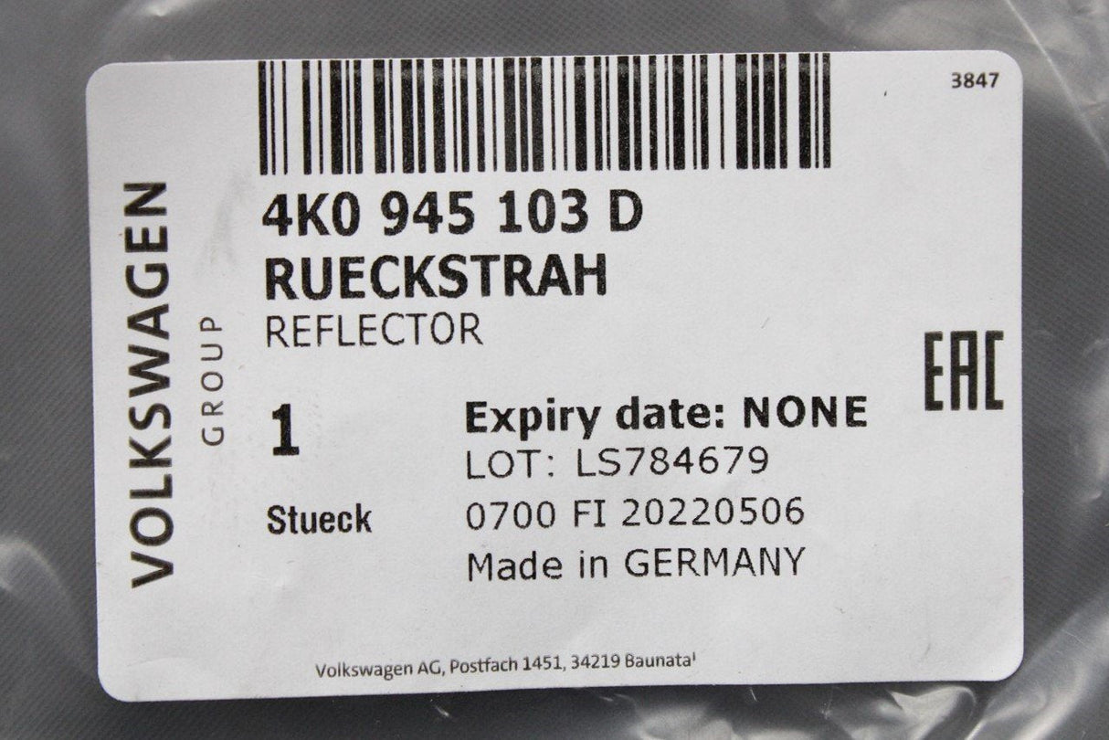 Audi A6 C8 2019-on rear bumper reflector lens (left, inner) 4K0945103D is backordered and will ship as soon as it is back in stock.
