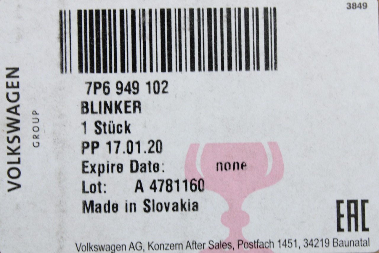 VW Touareg 7P 2011-18 wing mirror indicator repeater (right) 7P6949102 is backordered and will ship as soon as it is back in stock.