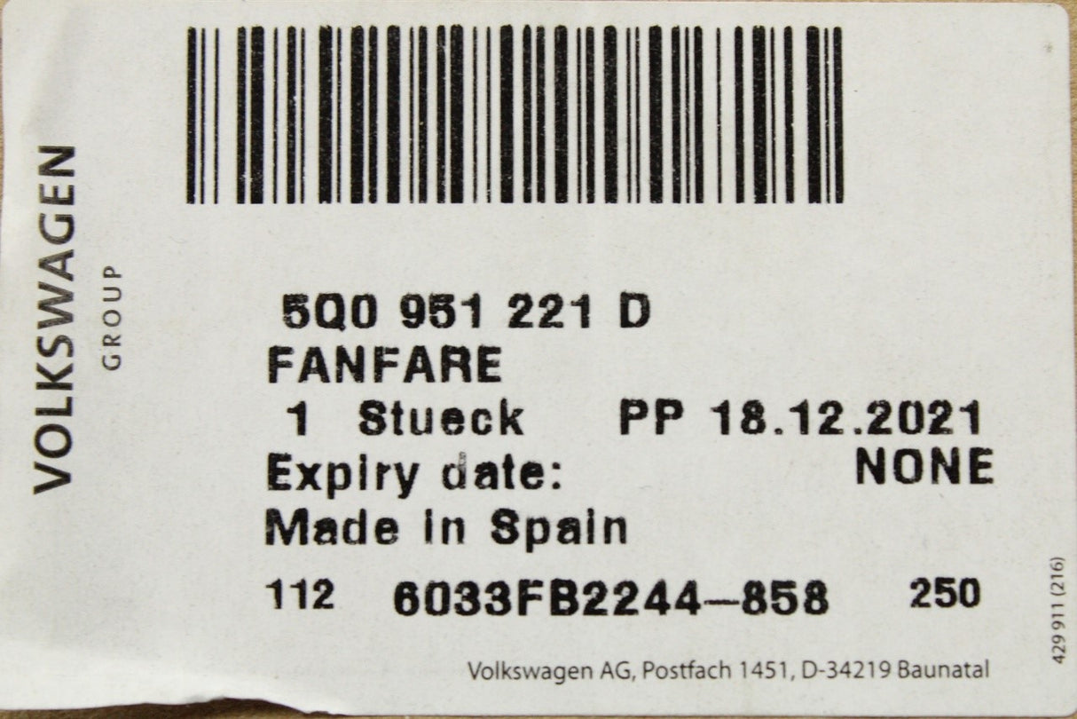 VW Golf MK7.5 Audi A1 Skoda Kodiaq SEAT low tone signal horn 5Q0951221D