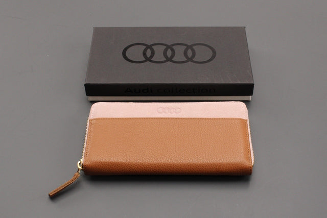 • This Audi leather wallet features a full metal zip, made with a combination of grained Italian cowhide and soft suede in complementary colours. It has 12 card slots, a coin compartment with a zipper, and a spacious open pocket. The front is adorned with an embossed Audi logo and it also offers RFID protection