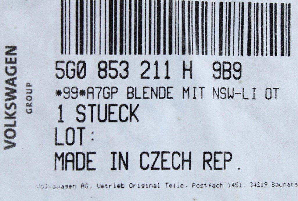 Part Number 5G0853211H 9B9