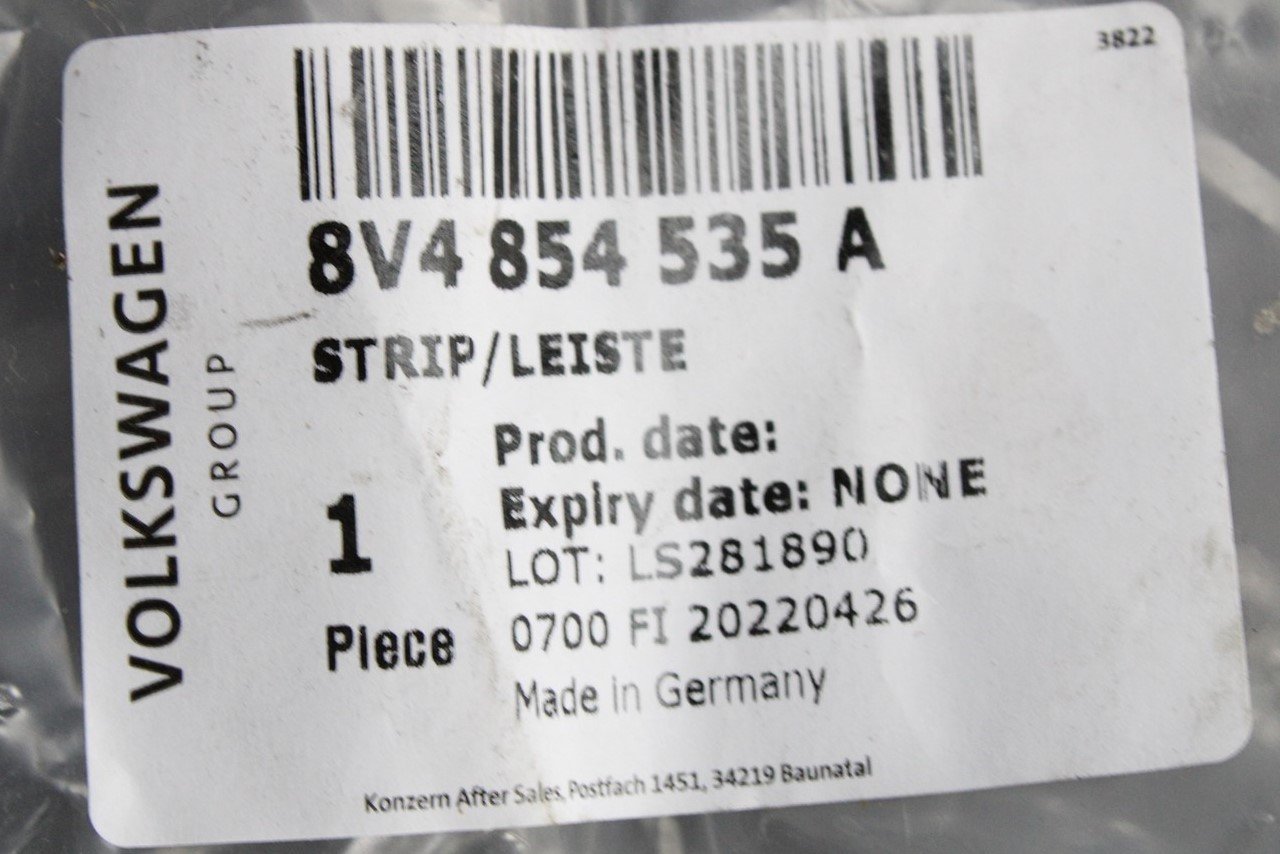 Audi A3 S3 RS3 8V 2013-20 side skirt securing strip (left) 8V4854535A is backordered and will ship as soon as it is back in stock.