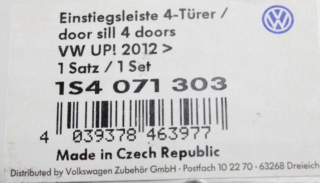 VW Up! 2012-on front & rear door sill protectors set (5 door) 1S4071303 is backordered and will ship as soon as it is back in stock.